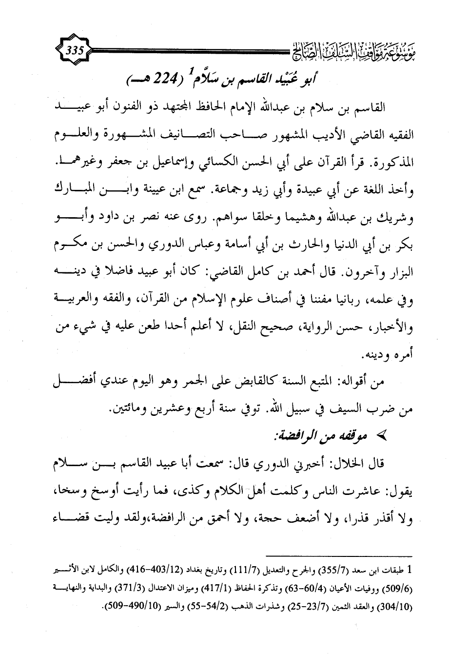 القاسم بن سلام بن عبد الله الإمام الحافظ المجتهد ذو الفنون أبو عبيد الفقيه القاضي الأديب المشهور صاحب التصانيف المشهورة والعلوم المذكورة. قرأ القرآن على أبي الحسن الكسائي وإسماعيل بن جعفر وغيرهما. وأخذ اللغة عن أبي عبيدة وأبي زيد وجماعة. سمع ابن عيينة وابن المبارك وشريك بن عبد الله وهشيما وخلقا سواهم. روى عنه نصر بن داود وأبو بكر بن أبي الدنيا والحارث بن أبي أسامة وعباس الدوري والحسن بن مكرم البزار وآخرون. قال أحمد بن كامل القاضي: كان أبو عبيد فاضلا في دينه وفي علمه، ربانيا مفننا في أصناف علوم الإسلام من القرآن، والفقه والعربية والأخبار، حسن الرواية، صحيح النقل، لا أعلم أحدا طعن عليه في شيء من أمره ودينه.