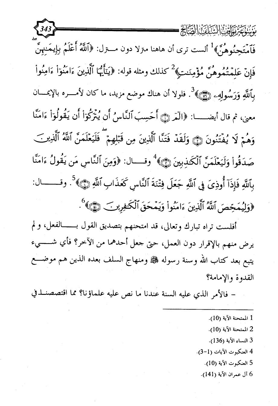 أفلست تراه تبارك وتعالى، قد امتحنهم بتصديق القول بالفعل، ولم يرض منهم بالإقرار دون العمل، حتى جعل أحدهما من الآخر؟ فأي شيء يتبع بعد كتاب الله وسنة رسوله - صلى الله عليه وسلم - ومنهاج السلف بعده الذين هم موضع القدوة والإمامة؟