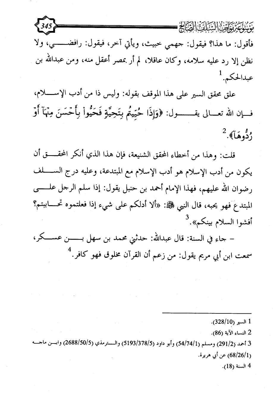 قلت: وهذا من أخطاء المحقق الشنيعة، فإن هذا الذي أنكر المحقق أن يكون من أدب الإسلام هو أدب الإسلام مع المبتدعة، وعليه درج السلف رضوان الله عليهم، فهذا الإمام أحمد بن حنبل يقول: إذا سلم الرجل على المبتدع فهو يحبه، قال النبي - صلى الله عليه وسلم -: "ألا أدلكم على شيء إذا فعلتموه تحاببتم؟ أفشوا السلام بينكم". (¬3)