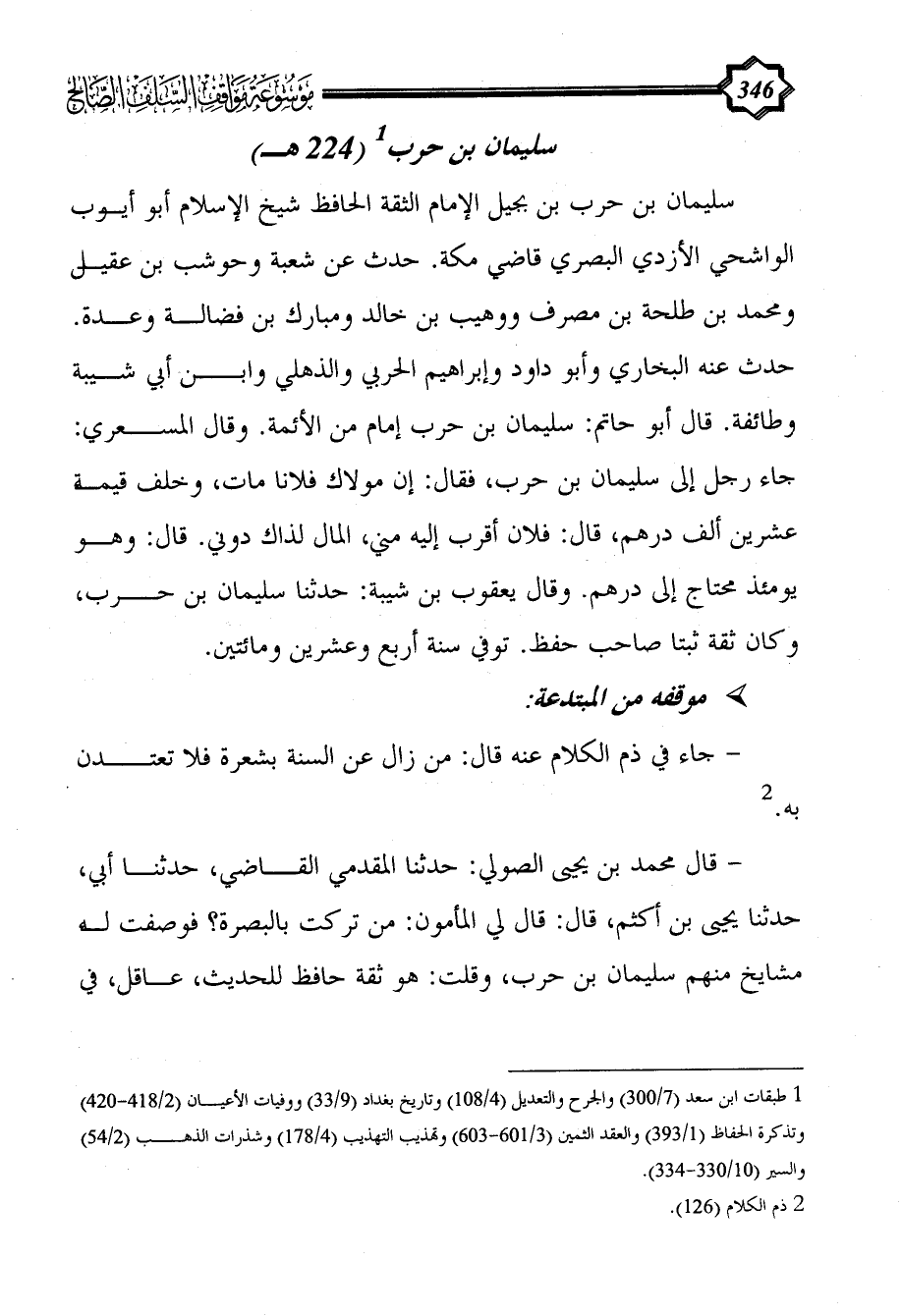 سليمان بن حرب بن بجيل الإمام الثقة الحافظ شيخ الإسلام أبو أيوب الواشحي الأزدي البصري قاضي مكة. حدث عن شعبة وحوشب بن عقيل ومحمد بن طلحة بن مصرف ووهيب بن خالد ومبارك بن فضالة وعدة. حدث عنه البخاري وأبو داود وإبراهيم الحربي والذهلي وابن أبي شيبة وطائفة. قال أبو حاتم: سليمان بن حرب إمام من الأئمة. وقال المسعري: جاء رجل إلى سليمان بن حرب، فقال: إن مولاك فلانا مات، وخلف قيمة عشرين ألف درهم، قال: فلان أقرب إليه مني، المال لذاك دوني. قال: وهو يومئذ محتاج إلى درهم. وقال يعقوب بن شيبة: حدثنا سليمان بن حرب، وكان ثقة ثبتا صاحب حفظ. توفي سنة أربع وعشرين ومائتين.
