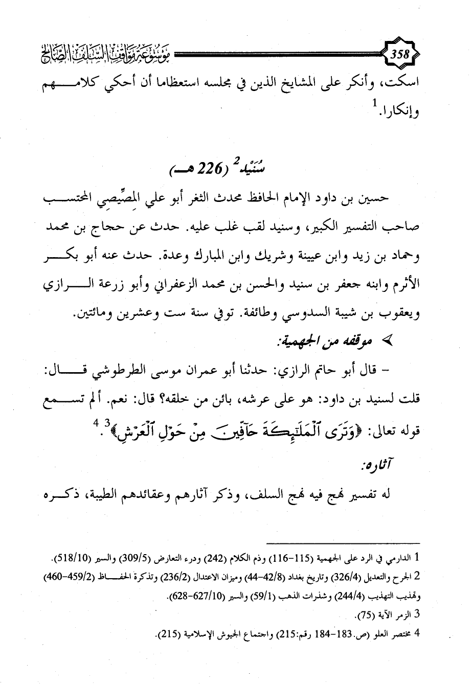 - قال أبو حاتم الرازي: حدثنا أبو عمران موسى الطرطوشي قال: قلت لسنيد بن داود: هو على عرشه، بائن من خلقه؟ قال: نعم. ألم تسمع قوله تعالى: {وترى الْمَلَائِكَةَ حافين مِنْ حَوْلِ الْعَرْشِ} (¬3). (¬4)