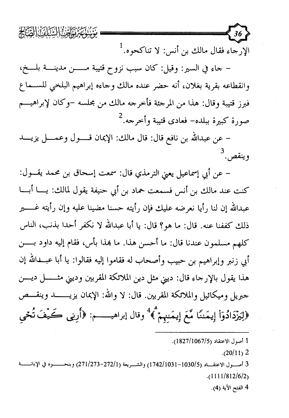 - عن عبد الله بن نافع قال: قال مالك: الإيمان قول وعمل يزيد وينقص. (¬3)