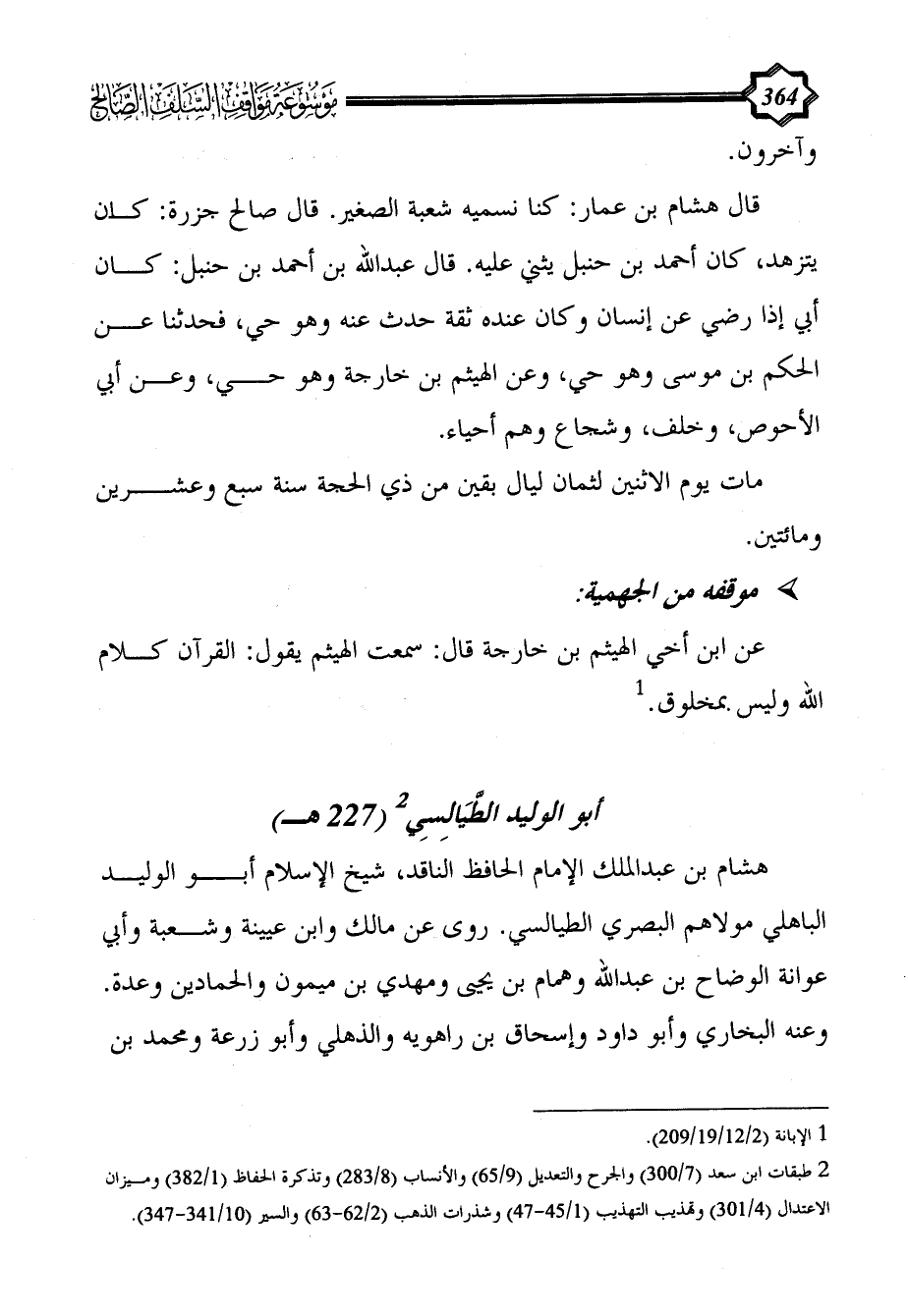 هشام بن عبد الملك الإمام الحافظ الناقد، شيخ الإسلام أبو الوليد الباهلي مولاهم البصري الطيالسي. روى عن مالك وابن عيينة وشعبة وأبي عوانة الوضاح بن عبد الله وهمام بن يحيى ومهدي بن ميمون والحمادين وعدة. وعنه البخاري وأبو داود وإسحاق بن راهويه والذهلي وأبو زرعة ومحمد بن