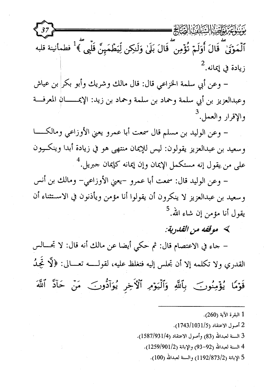 - وعن الوليد بن مسلم قال سمعت أبا عمرو يعني الأوزاعي ومالكا وسعيد بن عبد العزيز يقولون: ليس للإيمان منتهى هو في زيادة أبدا وينكرون على من يقول إنه مستكمل الإيمان وإن إيمانه كإيمان جبريل. (¬4)