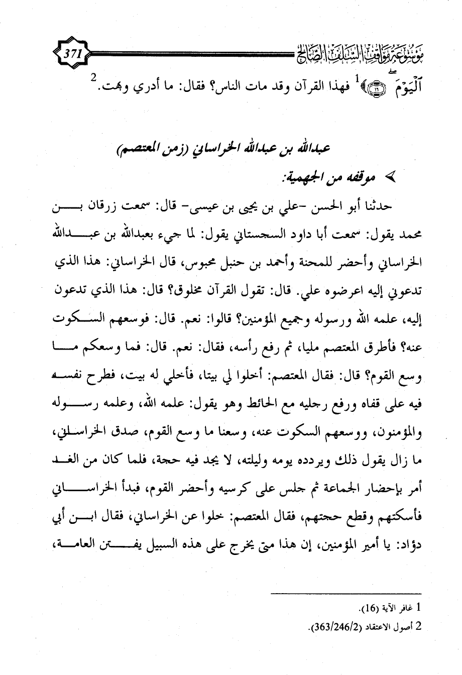 حدثنا أبو الحسن -علي بن يحيى بن عيسى- قال: سمعت زرقان بن محمد يقول: سمعت أبا داود السجستاني يقول: لما جيء بعبد الله بن عبد الله الخراساني وأحضر للمحنة وأحمد بن حنبل محبوس، قال الخراساني: هذا الذي تدعوني إليه اعرضوه علي. قال: تقول القرآن مخلوق؟ قال: هذا الذي تدعون إليه، علمه الله ورسوله وجميع المؤمنين؟ قالوا: نعم. قال: فوسعهم السكوت عنه؟ فأطرق المعتصم مليا، ثم رفع رأسه، فقال: نعم. قال: فما وسعكم ما وسع القوم؟ قال: فقال المعتصم: أخلوا لي بيتا، فأخلي له بيت، فطرح نفسه فيه على قفاه ورفع رجليه مع الحائط وهو يقول: علمه الله، وعلمه رسوله والمؤمنون، ووسعهم السكوت عنه، وسعنا ما وسع القوم، صدق الخراساني، ما زال يقول ذلك ويردده يومه وليلته، لا يجد فيه حجة، فلما كان من الغد أمر بإحضار الجماعة ثم جلس على كرسيه وأحضر القوم، فبدأ الخراساني فأسكتهم وقطع حجتهم، فقال المعتصم: خلوا عن الخراساني، فقال ابن أبي دؤاد: يا أمير المؤمنين، إن هذا متى يخرج على هذه السبيل يفتن العامة،