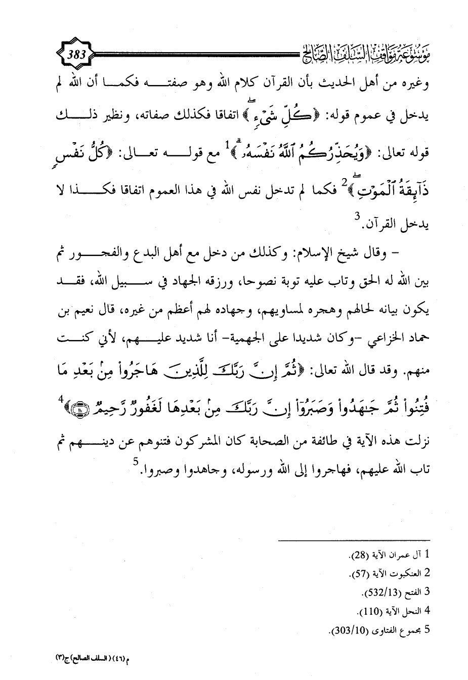 - وقال شيخ الإسلام: وكذلك من دخل مع أهل البدع والفجور ثم بين الله له الحق وتاب عليه توبة نصوحا، ورزقه الجهاد في سبيل الله، فقد يكون بيانه لحالهم وهجره لمساويهم، وجهاده لهم أعظم من غيره، قال نعيم بن حماد الخزاعي -وكان شديدا على الجهمية- أنا شديد عليهم، لأني كنت منهم. وقد قال الله تعالى: {ثُمَّ إِنَّ رَبَّكَ لِلَّذِينَ هَاجَرُوا مِنْ بَعْدِ مَا فُتِنُوا ثُمَّ جَاهَدُوا وَصَبَرُوا إِنَّ رَبَّكَ مِنْ بَعْدِهَا لَغَفُورٌ رَحِيمٌ} (¬4) نزلت هذه الآية في طائفة من الصحابة كان المشركون فتنوهم عن دينهم ثم تاب الله عليهم، فهاجروا إلى الله ورسوله، وجاهدوا وصبروا. (¬5)