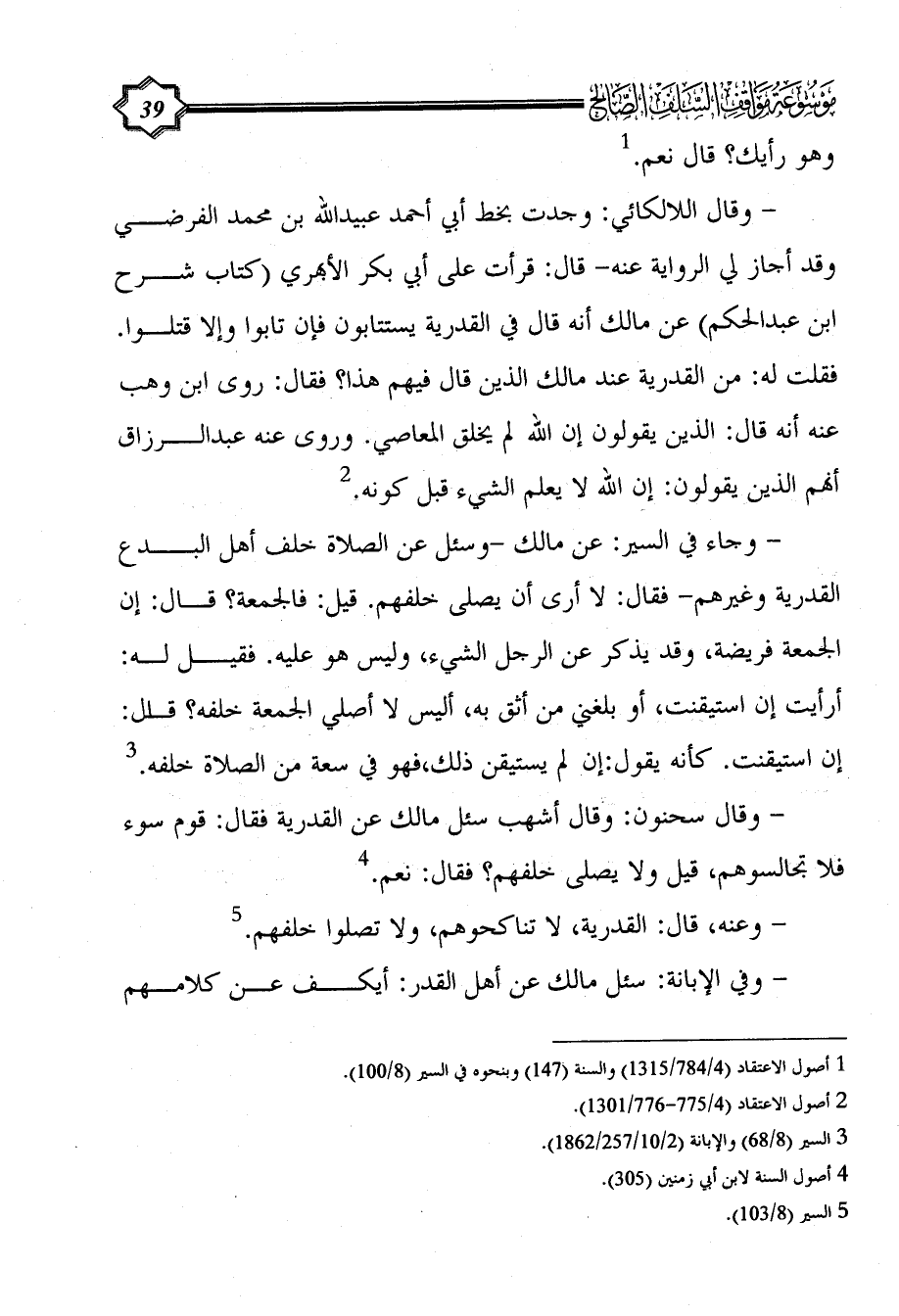 - وقال اللالكائي: وجدت بخط أبي أحمد عبيد الله بن محمد الفرضي وقد أجاز لي الرواية عنه- قال: قرأت على أبي بكر الأبهري (كتاب شرح ابن عبد الحكم) عن مالك أنه قال في القدرية يستتابون فإن تابوا وإلا قتلوا. فقلت له: من القدرية عند مالك الذين قال فيهم هذا؟ فقال: روى ابن وهب عنه أنه قال: الذين يقولون إن الله لم يخلق المعاصي. وروى عنه عبد الرزاق أنهم الذين يقولون: إن الله لا يعلم الشيء قبل كونه. (¬2)