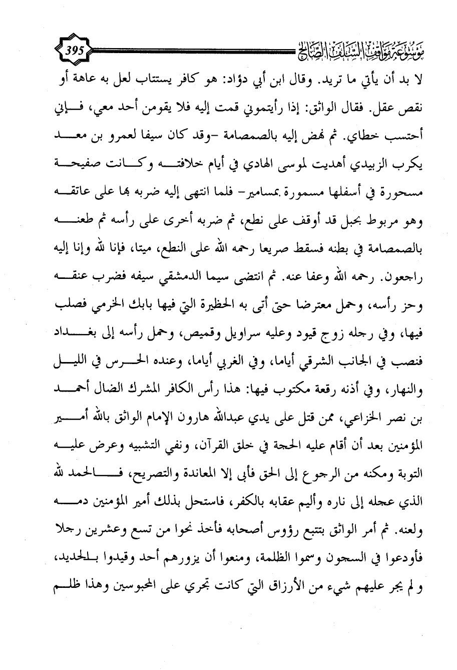 لا بد أن يأتي ما تريد. وقال ابن أبي دؤاد: هو كافر يستتاب لعل به عاهة أو نقص عقل. فقال الواثق: إذا رأيتموني قمت إليه فلا يقومن أحد معي، فإني أحتسب خطاي. ثم نهض إليه بالصمصامة -وقد كان سيفا لعمرو بن معد يكرب الزبيدي أهديت لموسى الهادي في أيام خلافته وكانت صفيحة مسحورة في أسفلها مسمورة بمسامير- فلما انتهى إليه ضربه بها على عاتقه وهو مربوط بحبل قد أوقف على نطع، ثم ضربه أخرى على رأسه ثم طعنه بالصمصامة في بطنه فسقط صريعا رحمه الله على النطع، ميتا، فإنا لله وإنا إليه راجعون. رحمه الله وعفا عنه.