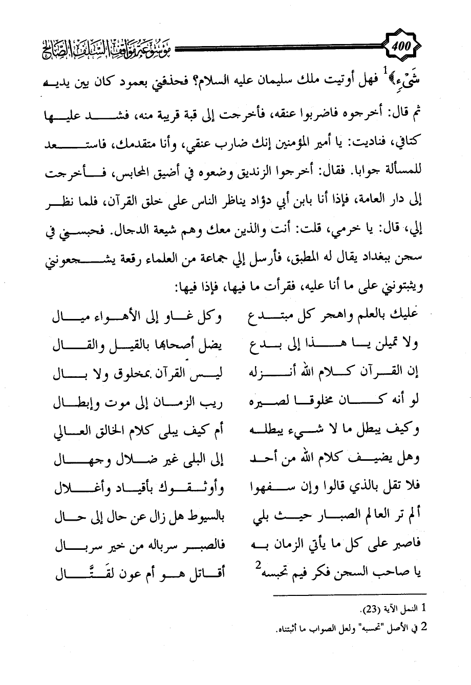 شَيْءٍ} (¬1) فهل أوتيت ملك سليمان عليه السلام؟ فحذفني بعمود كان بين يديه ثم قال: أخرجوه فاضربوا عنقه، فأخرجت إلى قبة قريبة منه، فشد عليها كتافي، فناديت: يا أمير المؤمنين إنك ضارب عنقي، وأنا متقدمك، فاستعد للمسألة جوابا. فقال: أخرجوا الزنديق وضعوه في أضيق المحابس، فأخرجت إلى دار العامة، فإذا أنا بابن أبي دؤاد يناظر الناس على خلق القرآن، فلما نظر إلي، قال: يا خرمي، قلت: أنت والذين معك وهم شيعة الدجال. فحبسني في سجن ببغداد يقال له المطبق، فأرسل إلي جماعة من العلماء رقعة يشجعونني ويثبتونني على ما أنا عليه، فقرأت ما فيها، فإذا فيها: