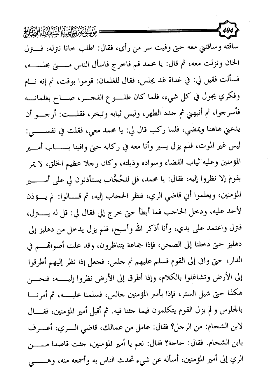 ساقته وساقتني معه حتى وفيت سر من رأى، فقال: اطلب خانا ننزله، فنزل الخان ونزلت معه، ثم قال: يا محمد قم فاخرج فاسأل الناس متى مجلسه، فسألت فقيل لي: في غداة غد يجلس، فقال للغلمان: قوموا بوقت، ثم إنه نام وفكري يجول في كل شيء، فلما كان طلوع الفجر، صاح بغلمانه فأسرجوا، ثم أنبهني ثم جدد الطهر، ولبس ثيابه وتبخر، فقلت: أرجو أن يدعني هاهنا ويمضي، فلما ركب قال لي: يا محمد معي، فقلت في نفسي: ليس غير الموت، فلم يزل يسير وأنا معه في ركابه حتى وافينا باب أمير المؤمنين وعليه ثياب القضاء وسواده وذيلته، وكان رجلا عظيم الخلق، لا يمر بقوم إلا نظروا إليه، فقال: يا محمد، قل للحُجَّاب يستأذنون لي على أمير المؤمنين، ويعلموا أني قاضي الري، فنظر الحجاب إليه، ثم قالوا: لم يؤذن لأحد عليه، ودخل الحاجب فما أبطأ حتى خرج إلي فقال لي: قل له ينزل، فنزل واعتمد على يدي، وأنا أذكر الله وأسبح، فلم يزل يدخل من دهليز إلى دهليز حتى دخلنا إلى الصحن، فإذا جماعة يتناظرون، وقد علت أصواتهم في الدار، حتى وافى إلى القوم فسلم عليهم ثم جلس، فجعل إذا نظر إليهم أطرقوا إلى الأرض وتشاغلوا بالكلام، وإذا أطرق إلى الأرض نظروا إليه، فنحن هكذا حتى شيل الستر، فإذا بأمير المؤمنين جالس، فسلمنا عليه، ثم أمرنا بالجلوس ولم يزل القوم يتكلمون فيما جئنا فيه. ثم أقبل أمير المؤمنين، فقال لابن الشحام: من الرجل؟ فقال: عامل من عمالك، قاضي الري، أعرف بابن الشحام. فقال: حاجة؟ فقال: نعم يا أمير المؤمنين، جئت قاصدا من الري إلى أمير المؤمنين، أسأله عن شيء تحدث الناس به وأسمعه منه، وهي