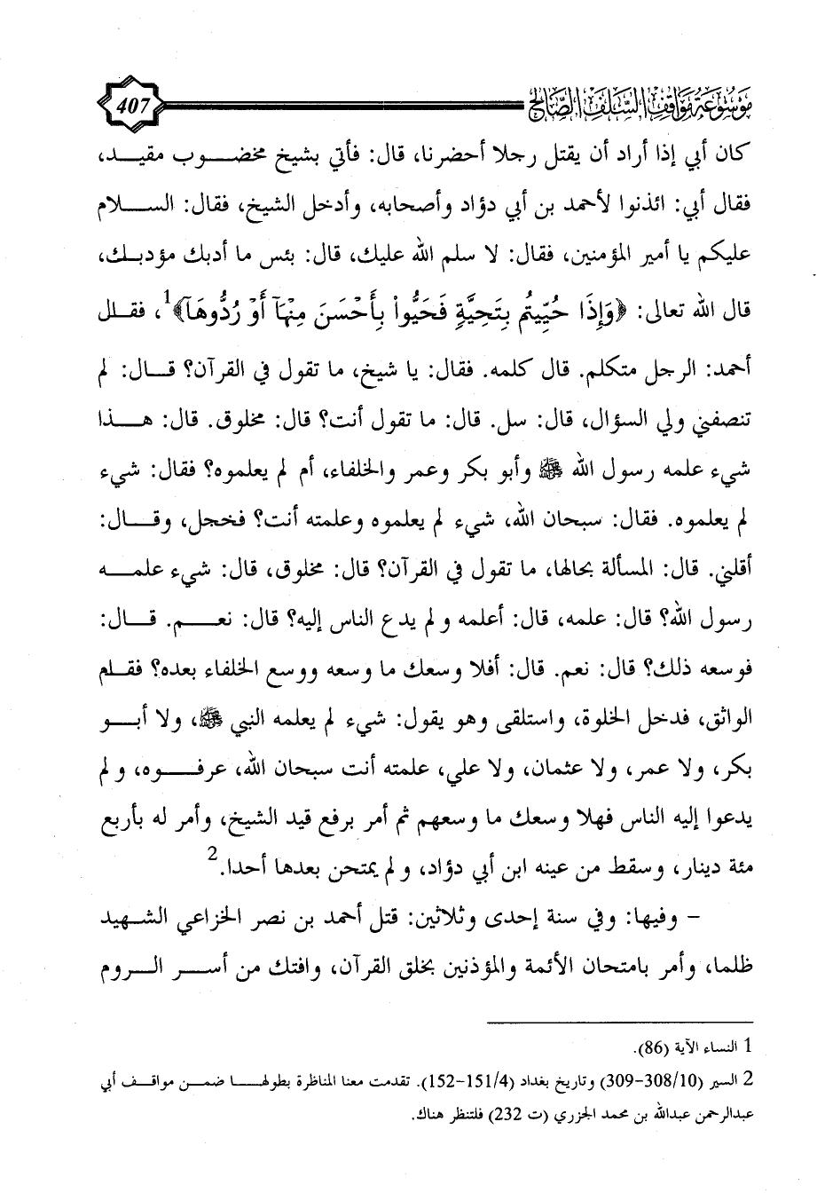 (¬2) السير (10/ 308 - 309) وتاريخ بغداد (4/ 151 - 152). تقدمت معنا المناظرة بطولها ضمن مواقف أبي عبد الرحمن عبد الله بن محمد الجزري (ت 232) فلتنظر هناك.