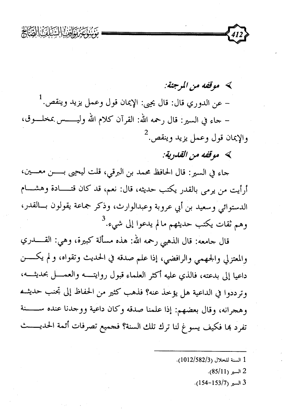 - جاء في السير: قال رحمه الله: القرآن كلام الله وليس بمخلوق، والإيمان قول وعمل يزيد وينقص. (¬2)