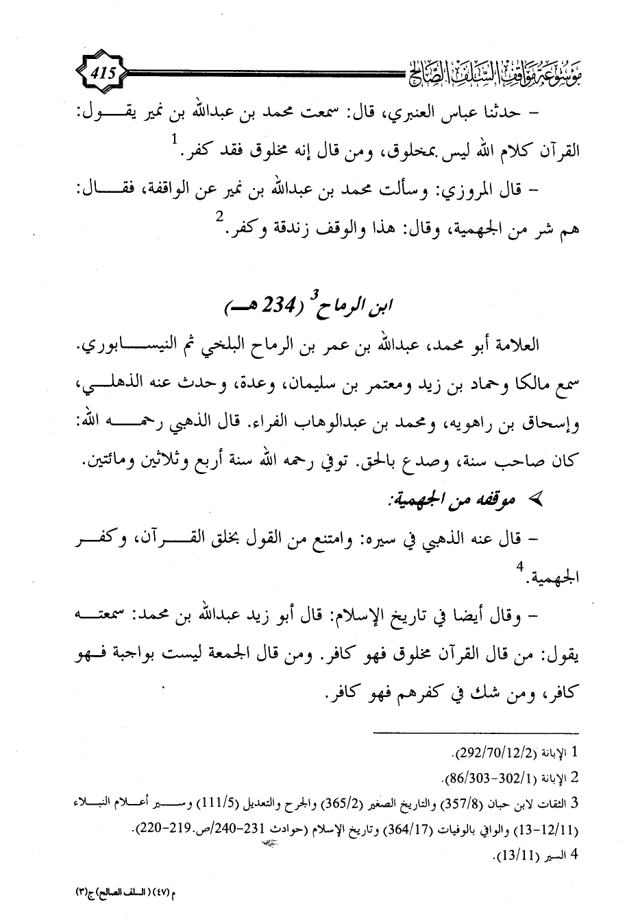 - قال المروزي: وسألت محمد بن عبد الله بن نمير عن الواقفة، فقال: هم شر من الجهمية، وقال: هذا والوقف زندقة وكفر. (¬2)