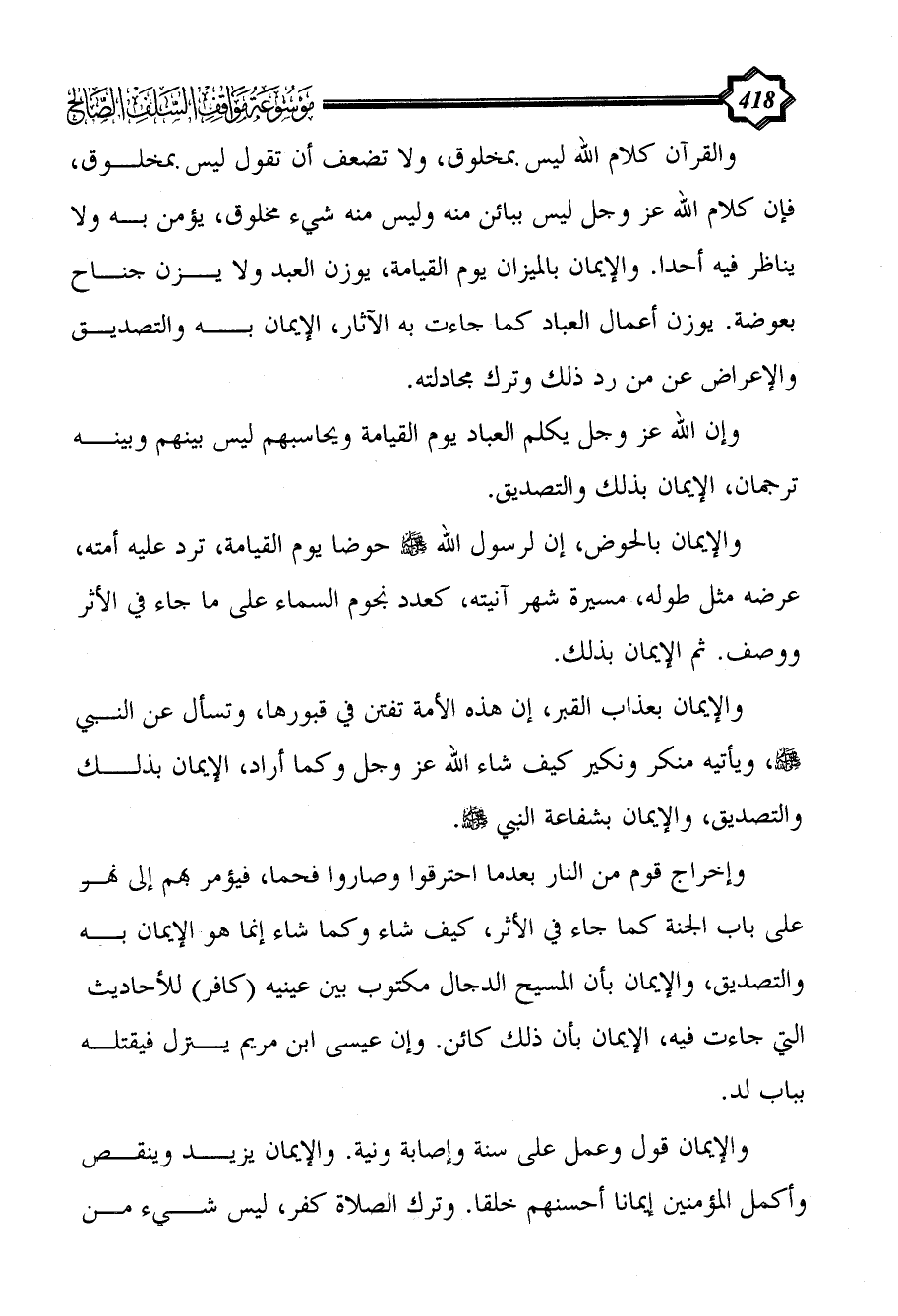 والإيمان قول وعمل على سنة وإصابة ونية. والإيمان يزيد وينقص وأكمل المؤمنين إيمانا أحسنهم خلقا. وترك الصلاة كفر، ليس شيء من