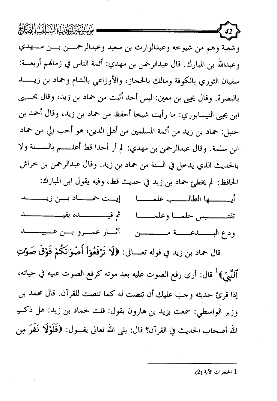 قال حماد بن زيد في قوله تعالى: {لا تَرْفَعُوا أَصْوَاتَكُمْ فَوْقَ صَوْتِ النَّبِيِّ} (¬1) قال: أرى رفع الصوت عليه بعد موته كرفع الصوت عليه في حياته، إذا قرئ حديثه وجب عليك أن تنصت له كما تنصت للقرآن. قال محمد بن وزير الواسطي: سمعت يزيد بن هارون يقول: قلت لحماد بن زيد: هل ذكر الله أصحاب الحديث في القرآن؟ قال: بلى الله تعالى يقول: {فلولا نَفَرَ مِنْ