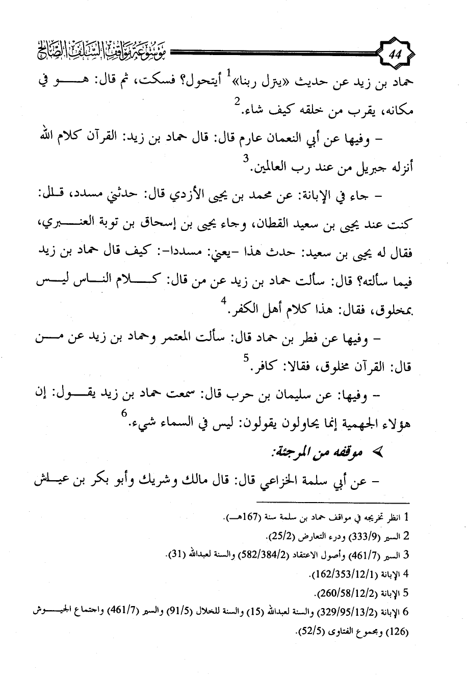 (¬6) الإبانة (2/ 13/95/ 329) والسنة لعبد الله (15) والسنة للخلال (5/ 91) والسير (7/ 461) واجتماع الجيوش (126) ومجموع الفتاوى (5/ 52).