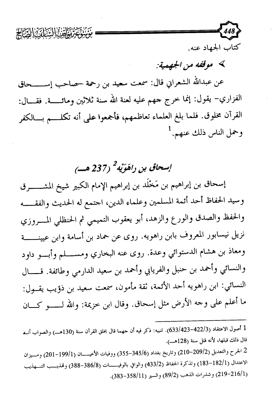 (¬1) أصول الاعتقاد (3/ 422 - 423/ 633). تنبيه: ذكر فيه أن جهما قال بخلق القرآن سنة (130هـ) والصواب أنه قال ذلك قبلها، لأنه قتل سنة (128هـ).