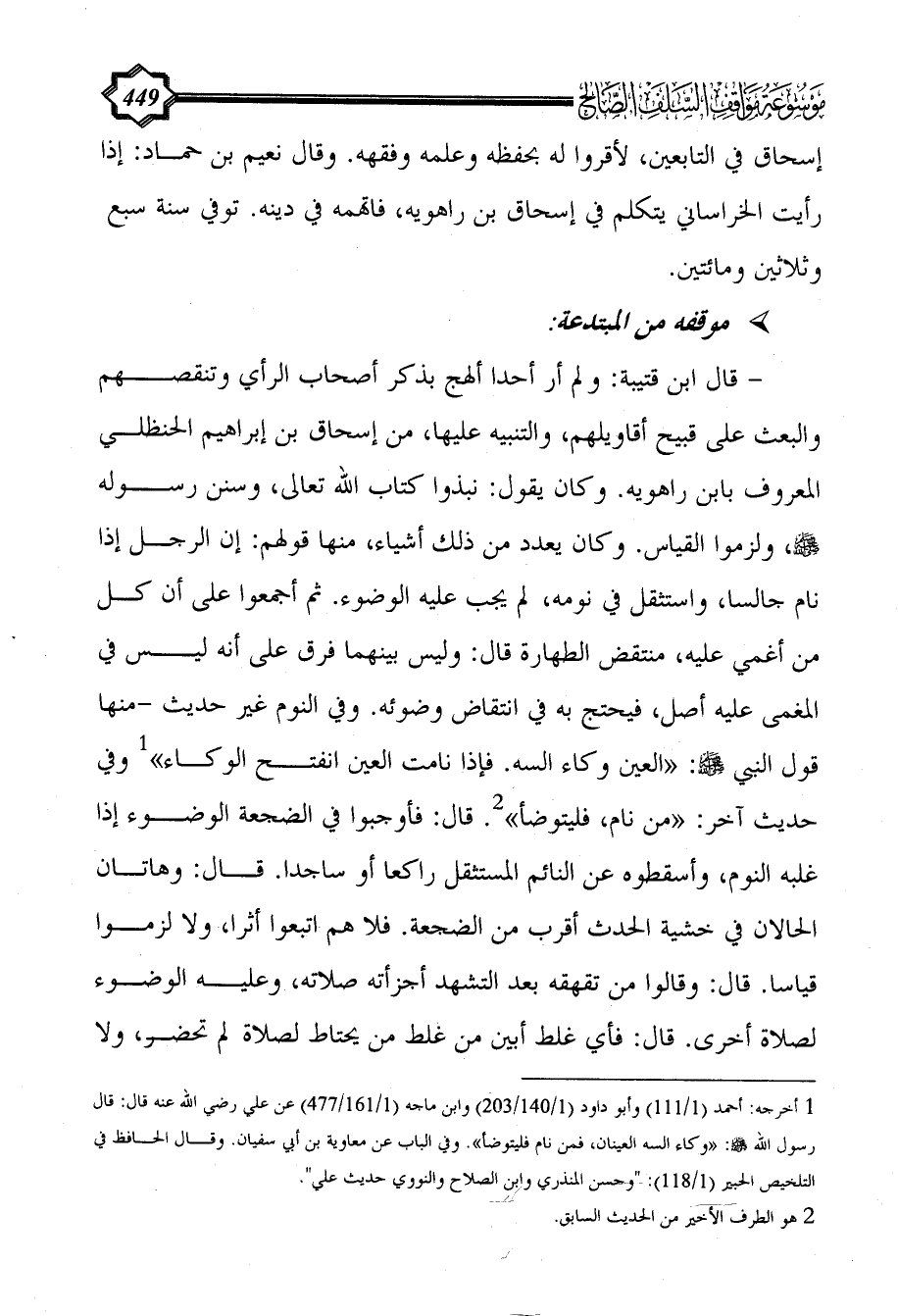 - قال ابن قتيبة: ولم أر أحدا ألهج بذكر أصحاب الرأي وتنقصهم والبعث على قبيح أقاويلهم، والتنبيه عليها، من إسحاق بن إبراهيم الحنظلي المعروف بابن راهويه. وكان يقول: نبذوا كتاب الله تعالى، وسنن رسوله - صلى الله عليه وسلم -، ولزموا القياس. وكان يعدد من ذلك أشياء، منها قولهم: إن الرجل إذا نام جالسا، واستثقل في نومه، لم يجب عليه الوضوء. ثم أجمعوا على أن كل من أغمي عليه، منتقض الطهارة قال: وليس بينهما فرق على أنه ليس في المغمى عليه أصل، فيحتج به في انتقاض وضوئه. وفي النوم غير حديث -منها قول النبي - صلى الله عليه وسلم -: "العين وكاء السه. فإذا نامت العين انفتح الوكاء" (¬1) وفي حديث آخر: "من نام، فليتوضأ" (¬2). قال: فأوجبوا في الضجعة الوضوء إذا غلبه النوم، وأسقطوه عن النائم المستثقل راكعا أو ساجدا. قال: وهاتان الحالان في خشية الحدث أقرب من الضجعة. فلا هم اتبعوا أثرا، ولا لزموا قياسا. قال: وقالوا من تقهقه بعد التشهد أجزأته صلاته، وعليه الوضوء لصلاة أخرى. قال: فأي غلط أبين من غلط من يحتاط لصلاة لم تحضر،