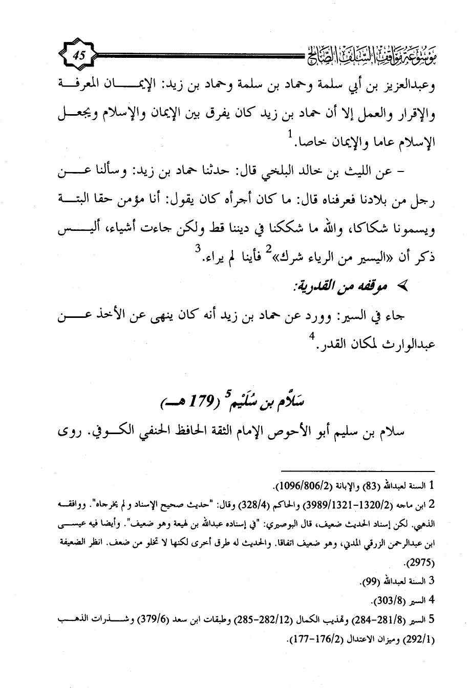 وعبد العزيز بن أبي سلمة وحماد بن سلمة وحماد بن زيد: الإيمان المعرفة والإقرار والعمل إلا أن حماد بن زيد كان يفرق بين الإيمان والإسلام ويجعل الإسلام عاما والإيمان خاصا. (¬1)