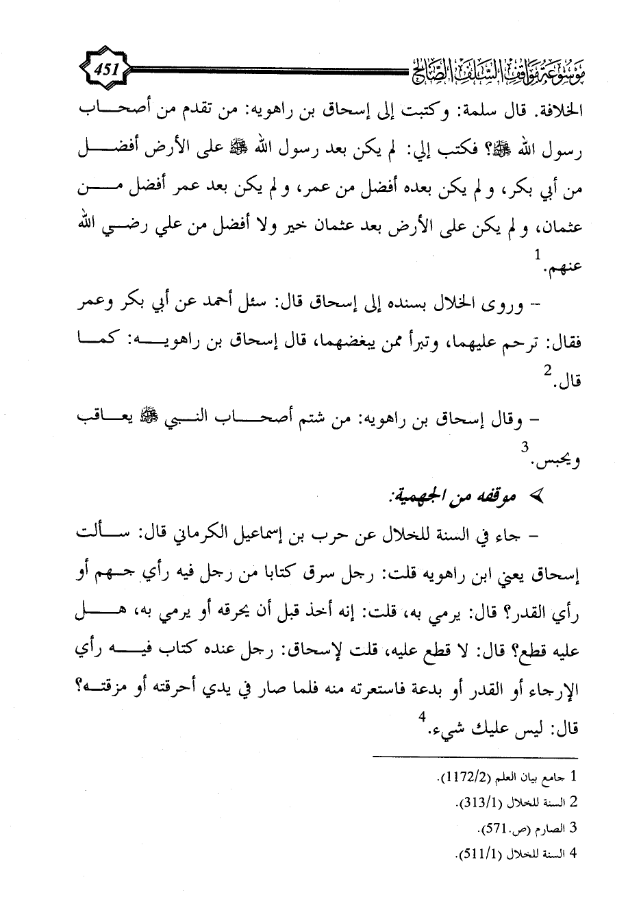 - جاء في السنة للخلال عن حرب بن إسماعيل الكرماني قال: سألت إسحاق يعني ابن راهويه قلت: رجل سرق كتابا من رجل فيه رأي جهم أو رأي القدر؟ قال: يرمي به، قلت: إنه أخذ قبل أن يحرقه أو يرمي به، هل عليه قطع؟ قال: لا قطع عليه، قلت لإسحاق: رجل عنده كتاب فيه رأي الإرجاء أو القدر أو بدعة فاستعرته منه فلما صار في يدي أحرقته أو مزقته؟ قال: ليس عليك شيء. (¬4)