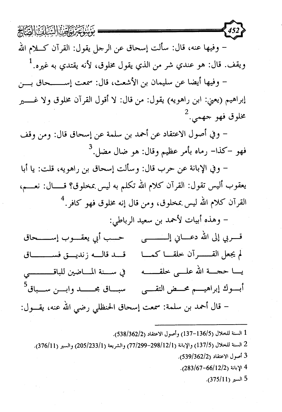 - وفيها أيضا عن سليمان بن الأشعث، قال: سمعت إسحاق بن إبراهيم (يعني: ابن راهويه) يقول: من قال: لا أقول القرآن مخلوق ولا غير مخلوق فهو جهمي. (¬2)