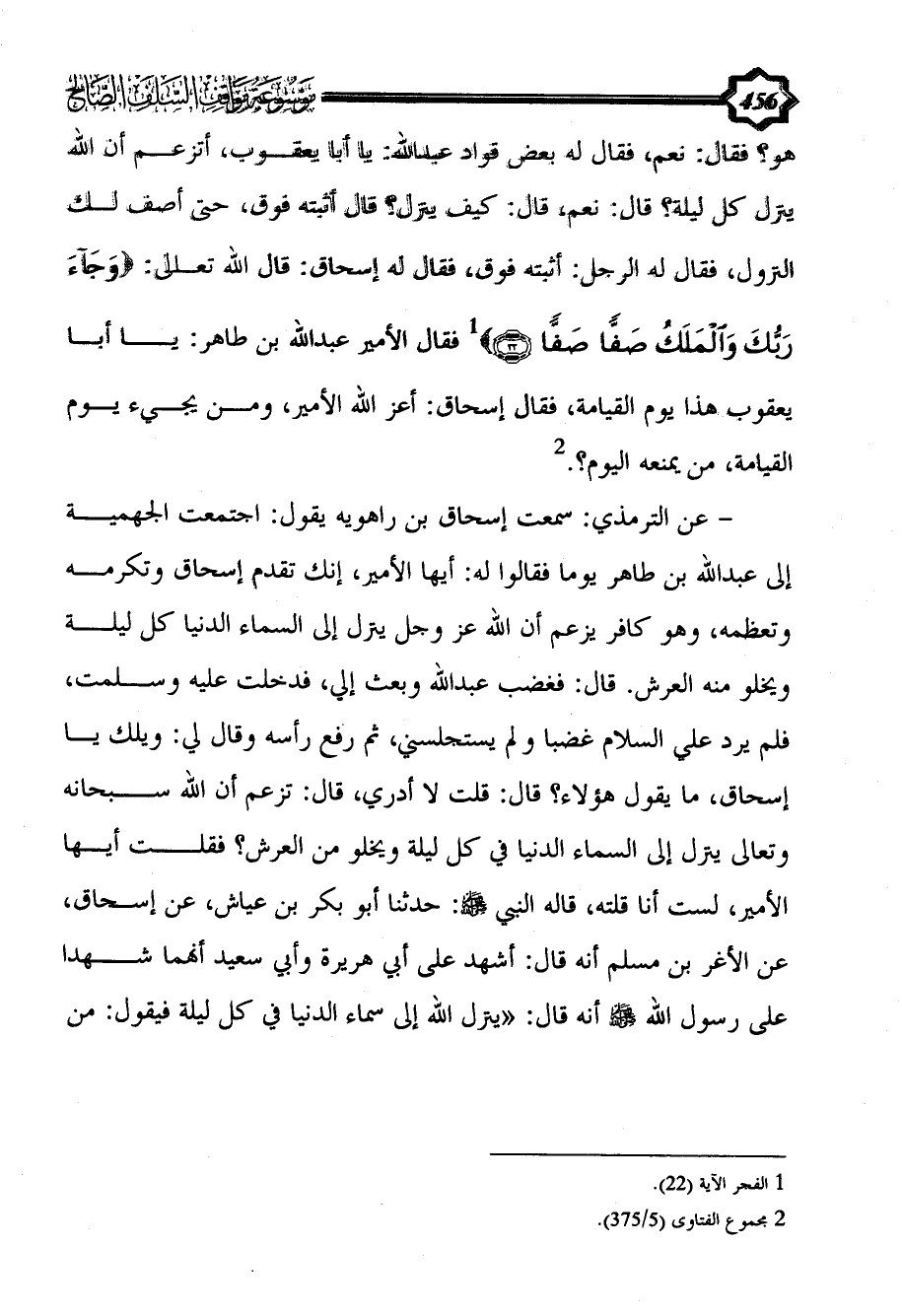 هو؟ فقال: نعم، فقال له بعض قواد عبد الله: يا أبا يعقوب، أتزعم أن الله ينزل كل ليلة؟ قال: نعم، قال: كيف ينزل؟ قال أثبته فوق، حتى أصف لك النزول، فقال له الرجل: أثبته فوق، فقال له إسحاق: قال الله تعالى: {وَجَاءَ ربك وَالْمَلَكُ صَفًّا صَفًّا} (¬1) فقال الأمير عبد الله بن طاهر: يا أبا يعقوب هذا يوم القيامة، فقال إسحاق: أعز الله الأمير، ومن يجيء يوم القيامة، من يمنعه اليوم؟. (¬2)