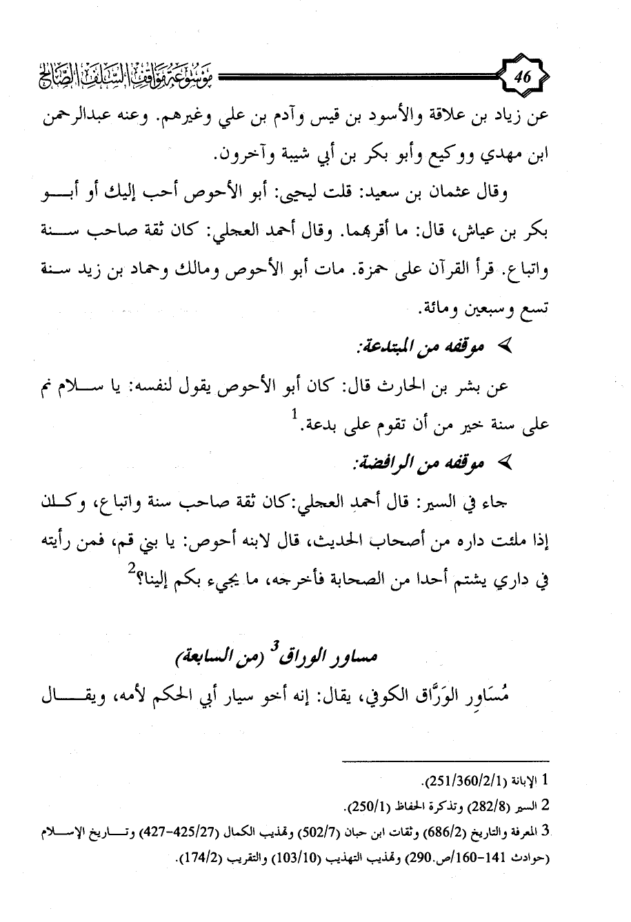 عن بشر بن الحارث قال: كان أبو الأحوص يقول لنفسه: يا سلام نم على سنة خير من أن تقوم على بدعة. (¬1)