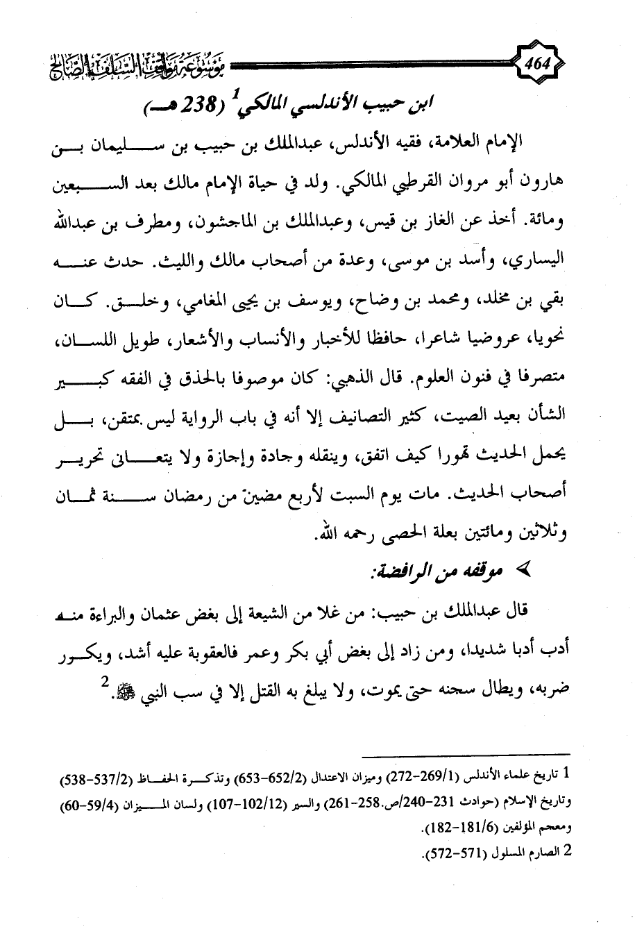 الإمام العلامة، فقيه الأندلس، عبد الملك بن حبيب بن سليمان بن هارون أبو مروان القرطبي المالكي. ولد في حياة الإمام مالك بعد السبعين ومائة. أخذ عن الغاز بن قيس، وعبد الملك بن الماجشون، ومطرف بن عبد الله اليساري، وأسد بن موسى، وعدة من أصحاب مالك والليث. حدث عنه بقي بن مخلد، ومحمد بن وضاح، ويوسف بن يحيى المغامي، وخلق. كان نحويا، عروضيا شاعرا، حافظا للأخبار والأنساب والأشعار، طويل اللسان، متصرفا في فنون العلوم. قال الذهبي: كان موصوفا بالحذق في الفقه كبير الشأن بعيد الصيت، كثير التصانيف إلا أنه في باب الرواية ليس بمتقن، بل يحمل الحديث تهورا كيف اتفق، وينقله وجادة وإجازة ولا يتعانى تحرير أصحاب الحديث. مات يوم السبت لأربع مضين من رمضان سنة ثمان وثلاثين ومائتين بعلة الحصى رحمه الله.