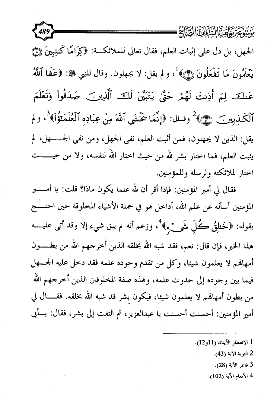 فقال لي أمير المؤمنين: فإذا أقر أن لله علما يكون ماذا؟ قلت: يا أمير المؤمنين أسأله عن علم الله، أداخل هو في جملة الأشياء المخلوقة حين احتج بقوله: {خَالِقُ كُلِّ شَيْءٍ} (¬4)، وزعم أنه لم يبق شيء إلا وقد أتى عليه هذا الخبر، فإن قال: نعم، فقد شبه الله بخلقه الذين أخرجهم الله من بطون أمهاتهم لا يعلمون شيئا، وكل من تقدم وجوده علمه فقد دخل عليه الجهل فيما بين وجوده إلى حدوث علمه، وهذه صفة المخلوقين الذين أخرجهم الله من بطون أمهاتهم لا يعلمون شيئا، فيكون بِشر قد شبه الله بخلقه. فقال لي أمير المؤمنين: أحسنت أحسنت يا عبد العزيز، ثم التفت إلى بشر، فقال: يأبى