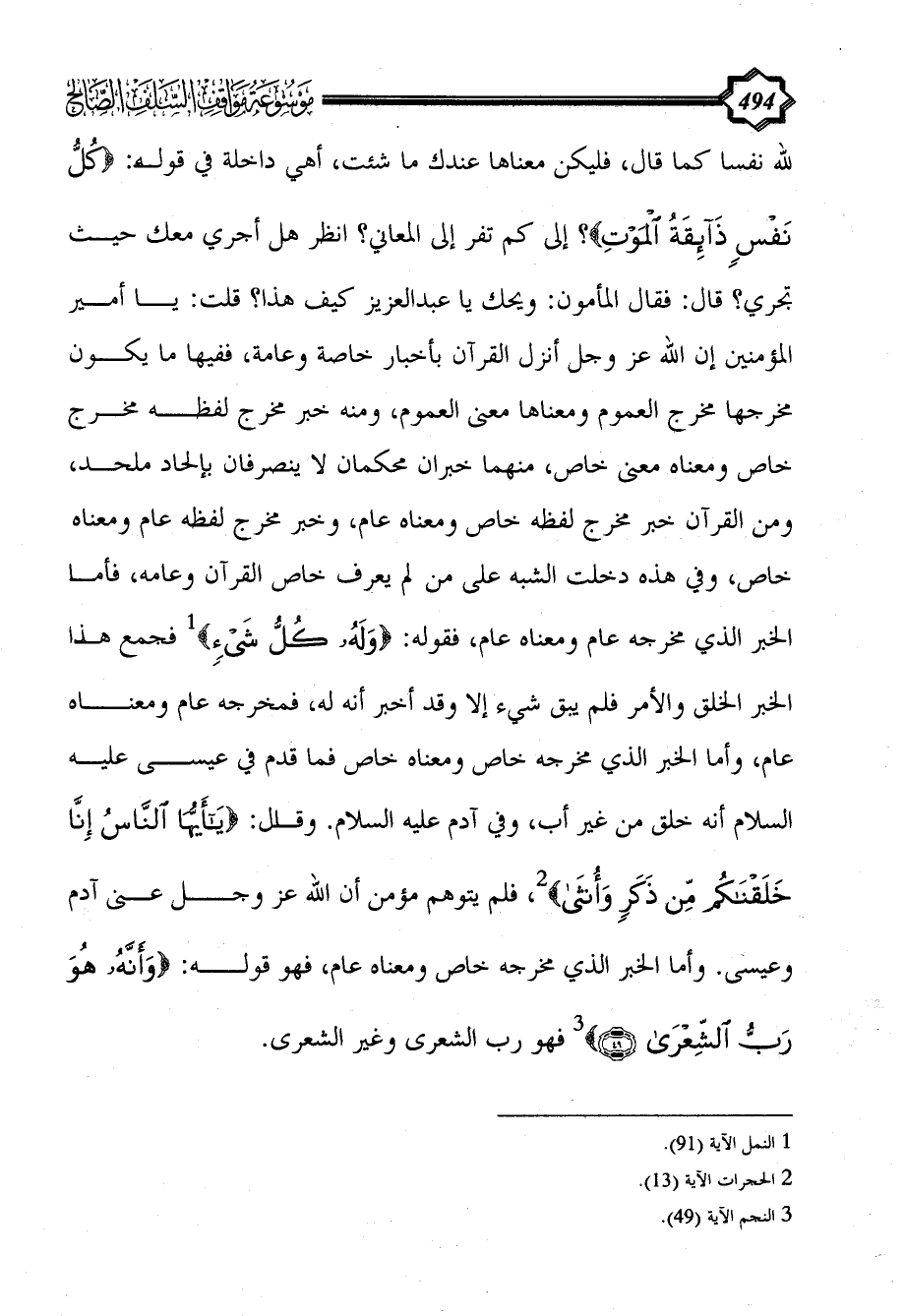 لله نفسا كما قال، فليكن معناها عندك ما شئت، أهي داخلة في قوله: {كل نفس ذائقة الموت}؟ إلى كم تفر إلى المعاني؟ انظر هل أجري معك حيث تجري؟ قال: فقال المأمون: ويحك يا عبد العزيز كيف هذا؟ قلت: يا أمير المؤمنين إن الله عز وجل أنزل القرآن بأخبار خاصة وعامة، ففيها ما يكون مخرجها مخرج العموم ومعناها معنى العموم، ومنه خبر مخرج لفظه مخرج خاص ومعناه معنى خاص، منهما خبران محكمان لا ينصرفان بإلحاد ملحد، ومن القرآن خبر مخرج لفظه خاص ومعناه عام، وخبر مخرج لفظه عام ومعناه خاص، وفي هذه دخلت الشبه على من لم يعرف خاص القرآن وعامه، فأما الخبر الذي مخرجه عام ومعناه عام، فقوله: {وَلَهُ كل شَيْءٍ} (¬1) فجمع هذا الخبر الخلق والأمر فلم يبق شيء إلا وقد أخبر أنه له، فمخرجه عام ومعناه عام، وأما الخبر الذي مخرجه خاص ومعناه خاص فما قدم في عيسى عليه السلام أنه خلق من غير أب، وفي آدم عليه السلام. وقال: {يا أيها النَّاسُ إِنَّا خَلَقْنَاكُمْ مِنْ ذكرٍ وَأُنْثَى} (¬2)، فلم يتوهم مؤمن أن الله عز وجل عنى آدم وعيسى. وأما الخبر الذي مخرجه خاص ومعناه عام، فهو قوله: {وَأَنَّهُ هُوَ رب الشِّعْرَى} (¬3) فهو رب الشعرى وغير الشعرى.