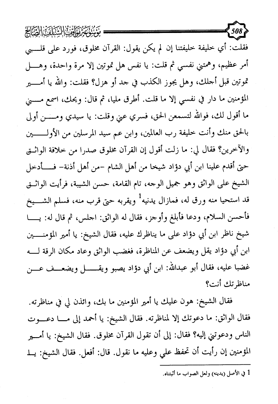 فقلت: أي خليفة خليفتنا إن لم يكن يقول: القرآن مخلوق، فورد على قلبي أمر عظيم، وهمتني نفسي ثم قلت: يا نفس هل تموتين إلا مرة واحدة، وهل تموتين قبل أجلك، وهل يجوز الكذب في جد أو هزل؟ فقلت: والله يا أمير المؤمنين ما دار في نفسي إلا ما قلت. أطرق مليا، ثم قال: ويحك، اسمع مني ما أقول لك، فوالله لتسمعن الحق، فسري عني وقلت: يا سيدي ومن أولى بالحق منك وأنت خليفة رب العالمين، وابن عم سيد المرسلين من الأولين والآخرين؟ فقال لي: ما زلت أقول إن القرآن مخلوق صدرا من خلافة الواثق حتى أقدم علينا ابن أبي دؤاد شيخا من أهل الشام -من أهل أذنة- فأدخل الشيخ على الواثق وهو جميل الوجه، تام القامة، حسن الشيبة، فرأيت الواثق قد استحيا منه ورق له، فمازال يدنيه (¬1) ويقربه حتى قرب منه، فسلم الشيخ فأحسن السلام، ودعا فأبلغ وأوجز، فقال له الواثق: اجلس، ثم قال له: يا شيخ ناظر ابن أبي دؤاد على ما يناظرك عليه، فقال الشيخ: يا أمير المؤمنين ابن أبي دؤاد يقل ويضعف عن المناظرة، فغضب الواثق وعاد مكان الرقة له غضبا عليه، فقال أبو عبد الله: ابن أبي دؤاد يصبو ويقل ويضعف عن مناظرتك أنت؟