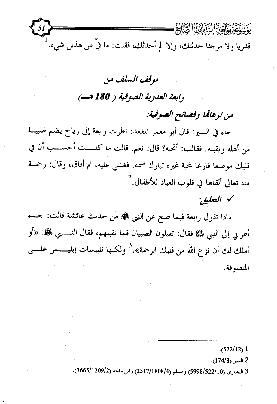 ماذا تقول رابعة فيما صح عن النبي - صلى الله عليه وسلم - من حديث عائشة قالت: جاء أعرابي إلى النبي - صلى الله عليه وسلم - فقال: تقبلون الصبيان فما نقبلهم، فقال النبي - صلى الله عليه وسلم -: "أو أملك لك أن نزع الله من قلبك الرحمة". (¬3) ولكنها تلبيسات إبليس على المتصوفة.