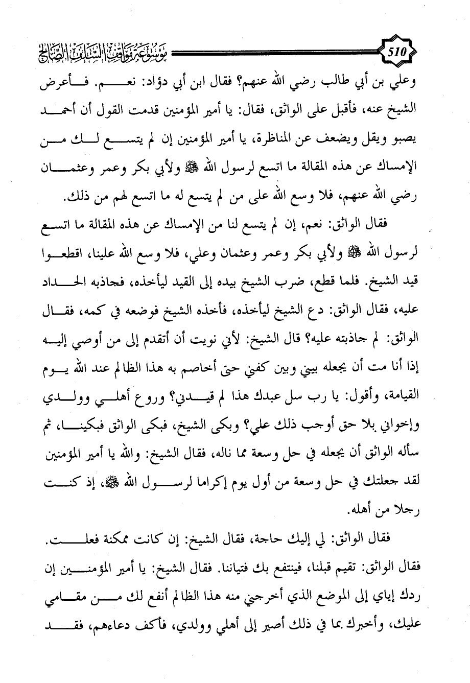 وعلي بن أبي طالب رضي الله عنهم؟ فقال ابن أبي دؤاد: نعم. فأعرض الشيخ عنه، فأقبل على الواثق، فقال: يا أمير المؤمنين قدمت القول أن أحمد يصبو ويقل ويضعف عن المناظرة، يا أمير المؤمنين إن لم يتسع لك من الإمساك عن هذه المقالة ما اتسع لرسول الله - صلى الله عليه وسلم - ولأبي بكر وعمر وعثمان رضي الله عنهم، فلا وسع الله على من لم يتسع له ما اتسع لهم من ذلك.