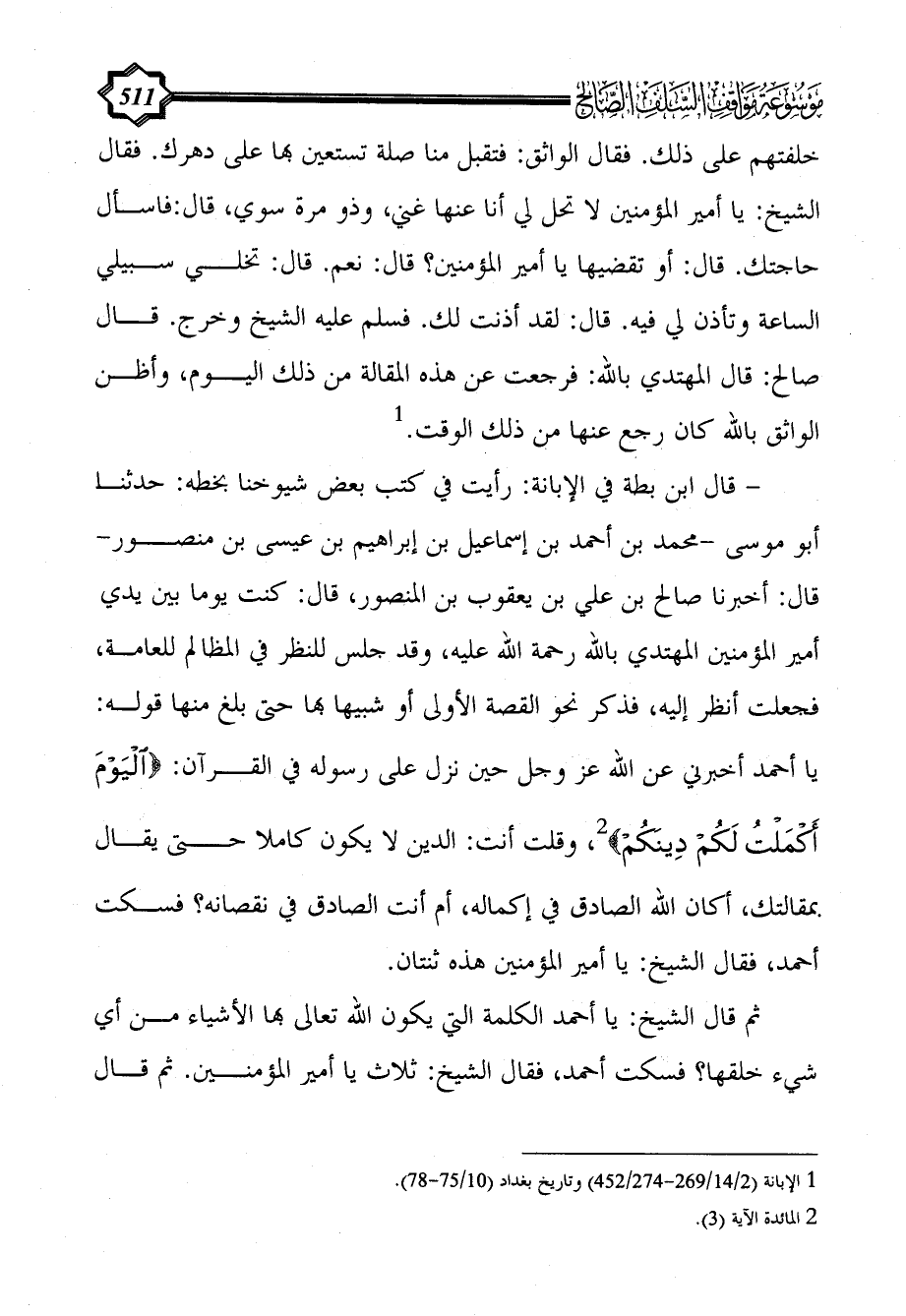 - قال ابن بطة في الإبانة: رأيت في كتب بعض شيوخنا بخطه: حدثنا أبو موسى -محمد بن أحمد بن إسماعيل بن إبراهيم بن عيسى بن منصور- قال: أخبرنا صالح بن علي بن يعقوب بن المنصور، قال: كنت يوما بين يدي أمير المؤمنين المهتدي بالله رحمة الله عليه، وقد جلس للنظر في المظالم للعامة، فجعلت أنظر إليه، فذكر نحو القصة الأولى أو شبيها بها حتى بلغ منها قوله: يا أحمد أخبرني عن الله عز وجل حين نزل على رسوله في القرآن: {الْيَوْمَ أَكْمَلْتُ لَكُمْ دِينَكُمْ} (¬2)، وقلت أنت: الدين لا يكون كاملا حتى يقال بمقالتك، أكان الله الصادق في إكماله، أم أنت الصادق في نقصانه؟ فسكت أحمد، فقال الشيخ: يا أمير المؤمنين هذه ثنتان.