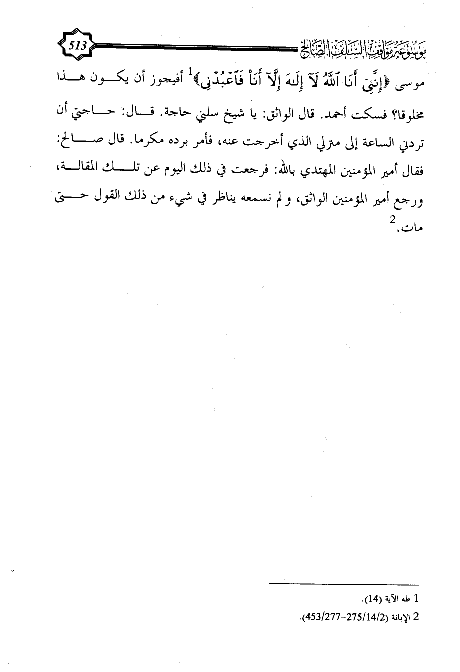 موسى {إِنَّنِي أَنَا اللَّهُ لَا إِلَهَ إِلَّا أَنَا فَاعْبُدْنِي} (¬1) أفيجوز أن يكون هذا مخلوقا؟ فسكت أحمد. قال الواثق: يا شيخ سلني حاجة. قال: حاجتي أن تردني الساعة إلى منزلي الذي أخرجت عنه، فأمر برده مكرما. قال صالح: فقال أمير المؤمنين المهتدي بالله: فرجعت في ذلك اليوم عن تلك المقالة، ورجع أمير المؤمنين الواثق، ولم نسمعه يناظر في شيء من ذلك القول حتى مات. (¬2)