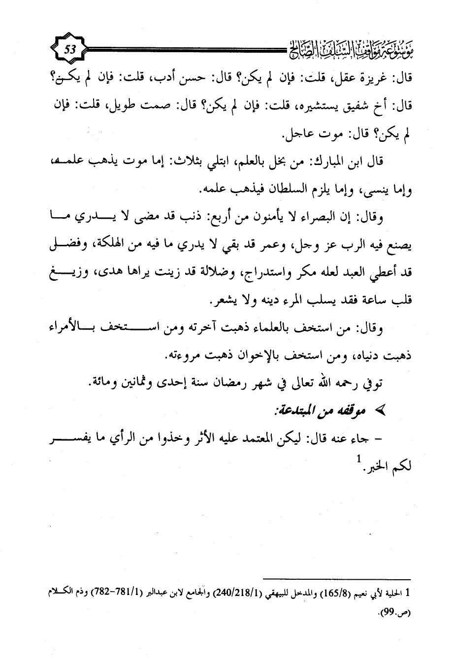 (¬1) الحلية لأبي نعيم (8/ 165) والمدخل للبيهقي (1/ 218/240) والجامع لابن عبد البر (1/ 781 - 782) وذم الكلام (ص.99).