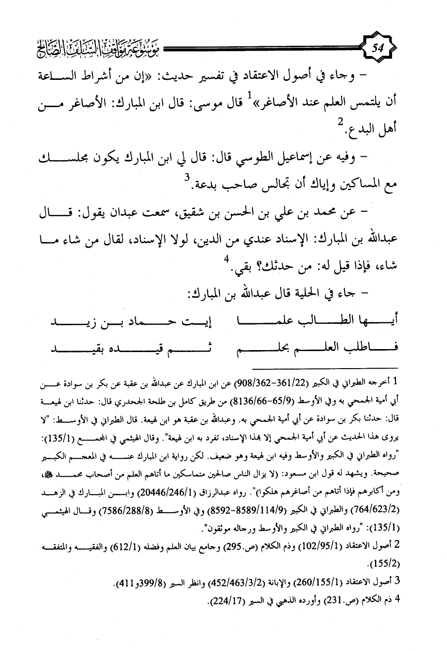 - وجاء في أصول الاعتقاد في تفسير حديث: "إن من أشراط الساعة أن يلتمس العلم عند الأصاغر" (¬1) قال موسى: قال ابن المبارك: الأصاغر من أهل البدع. (¬2)