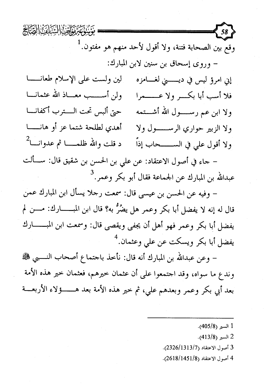 - وعن عبد الله بن المبارك أنه قال: نأخذ باجتماع أصحاب النبي - صلى الله عليه وسلم - وندع ما سواه، وقد اجتمعوا على أن عثمان خيرهم، فعثمان خير هذه الأمة بعد أبي بكر وعمر وبعدهم علي، ثم خير هذه الأمة بعد هؤلاء الأربعة
