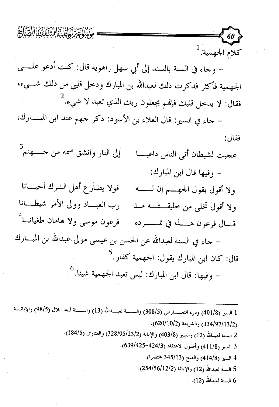 - جاء في السنة لعبد الله عن الحسن بن عيسى مولى عبد الله بن المبارك قال: كان ابن المبارك يقول: الجهمية كفار. (¬5)