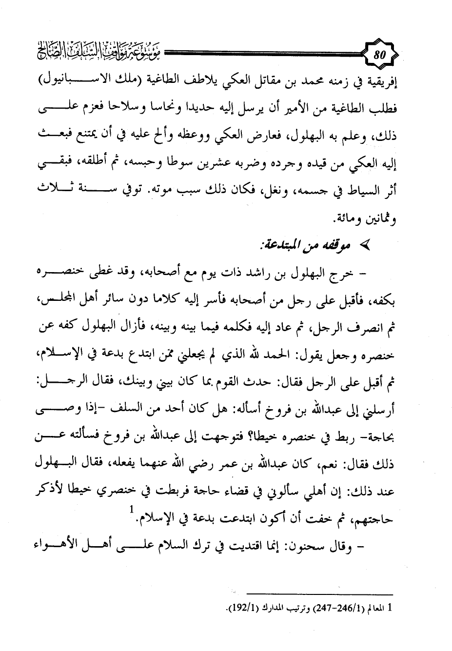 - وقال سحنون: إنما اقتديت في ترك السلام على أهل الأهواء