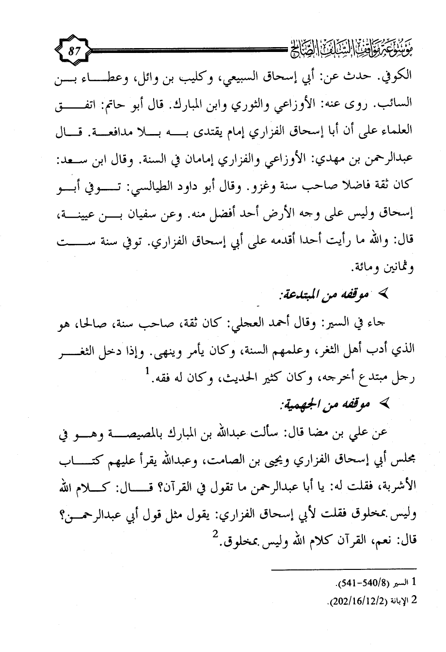 عن علي بن مضا قال: سألت عبد الله بن المبارك بالمصيصة وهو في مجلس أبي إسحاق الفزاري ويحيى بن الصامت، وعبد الله يقرأ عليهم كتاب الأشربة، فقلت له: يا أبا عبد الرحمن ما تقول في القرآن؟ قال: كلام الله وليس بمخلوق فقلت لأبي إسحاق الفزاري: يقول مثل قول أبي عبد الرحمن؟ قال: نعم، القرآن كلام الله وليس بمخلوق. (¬2)
