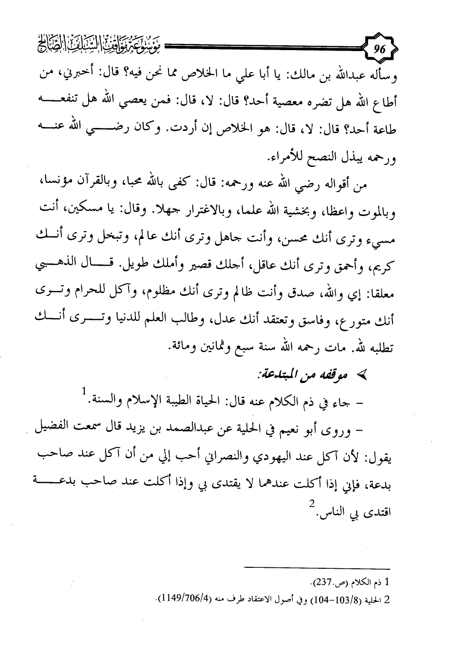 - وروى أبو نعيم في الحلية عن عبد الصمد بن يزيد قال سمعت الفضيل يقول: لأن آكل عند اليهودي والنصراني أحب إلي من أن آكل عند صاحب بدعة، فإني إذا أكلت عندهما لا يقتدى بي وإذا أكلت عند صاحب بدعة اقتدى بي الناس. (¬2)