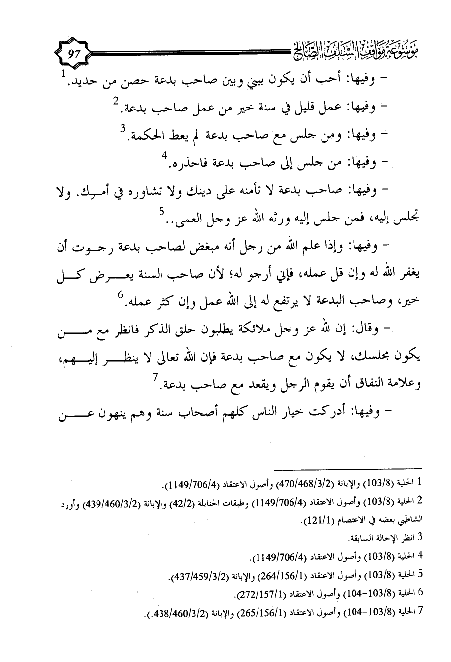 (¬2) الحلية (8/ 103) وأصول الاعتقاد (4/ 706/1149) وطبقات الحنابلة (2/ 42) والإبانة (2/ 3/460/ 439) وأورد الشاطبي بعضه في الاعتصام (1/ 121).