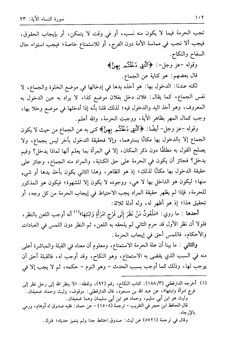 وقوله - عَزَّ وَجَلَّ - أيضًا: (اللَّاتِي دَخَلْتُمْ بِهِنَّ) كنى به عن الجماع من حيث لا يكون الجماع إلا بالدخول بها مكانًا يسترهما، وإلا فحقيقة الدخول بآخر ليس بجماع، ولا يصلح القول به مطلقًا دون ذكر المكان، إلا في المرأة بما يعلم أنها لماذا يدخل؟ وفيم يدخل؟ فجائز أن يكون في الحرمة على حق الكناية، والمراد منه الجماع، وجائز على حقيقة الدخول بها مكانًا لذلك؛ إذ هو الظاهر، وهذا الثاني يكون بأخذ يدها أو شيء منها؛ ليكون هو الداخل بها لا هي، ووجوده لا يكون إلا للشهوة؛ فيكون هو المذكور للحرمة، فإذا لم يظهر حقيقة المراد يجب الاحتياط في إيجاب الحرمة من كل وجه، أو تحقيق هذا؛ إذ هو أظهر له، وله أدلة ثلاثة: