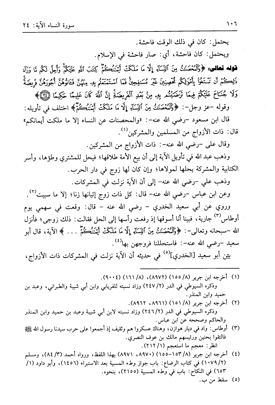 وروي عن أبي سعيد الخدري - رَضِيَ اللَّهُ عَنْهُ - قال: وقعت في سهمي يوم أوطاس جارية، فبينا أنا أسوقها إذ رفعت رأسها إلى الحل فقالت: ذلك زوجي؛ فأنزل اللَّه - سبحانه وتعالى -: (وَالْمُحْصَنَاتُ مِنَ النِّسَاءِ إِلَّا مَا مَلَكَتْ أَيْمَانُكُمْ. . .) الآية، قال أبو سعيد - رَضِيَ اللَّهُ عَنْهُ -: فاستحللنا فروجهن بها.
