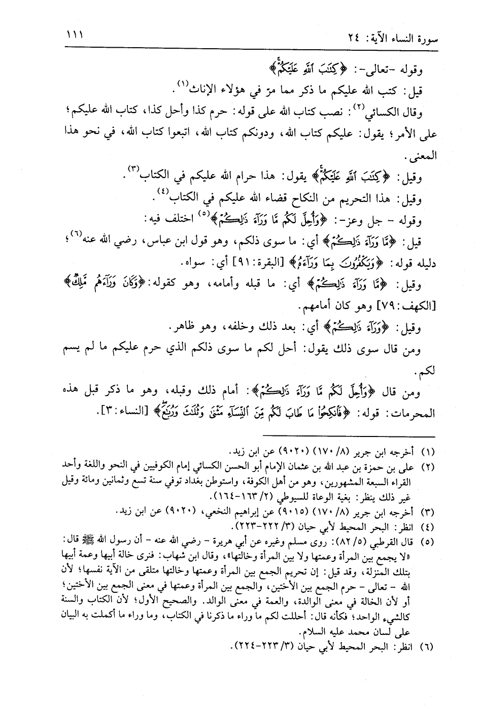 وقال الكسائي: نصب كتاب اللَّه على قوله: حرم كذا وأحل كذا، كتاب اللَّه عليكم؛ على الأمر؛ يقول: عليكم كتاب اللَّه، ودونكم كتاب اللَّه، اتبعوا كتاب اللَّه، في نحو هذا المعنى.