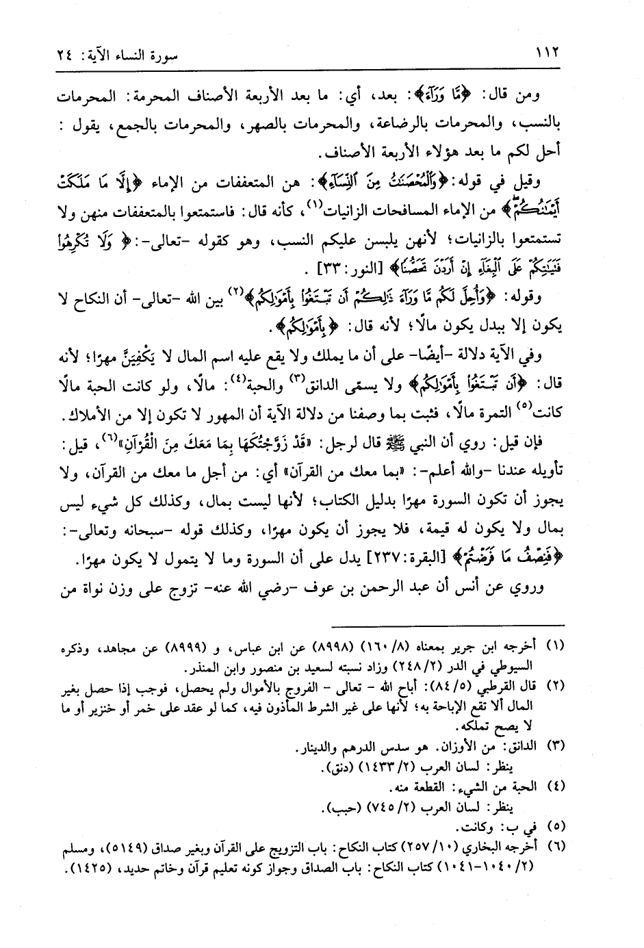 وفي الآية دلالة -أيضًا- على أن ما يملك ولا يقع عليه اسم المال لا يَكْفِيَنَ مهرًا؛ لأنه قال: (أَنْ تَبْتَغُوا بِأَمْوَالِكُمْ) ولا يسمَّى الدانق والحبة: مالًا، ولو كانت الحبة مالًا كانت التمرة مالًا، فثبت بما وصفنا من دلالة الآية أن المهور لا تكون إلا من الأملاك.