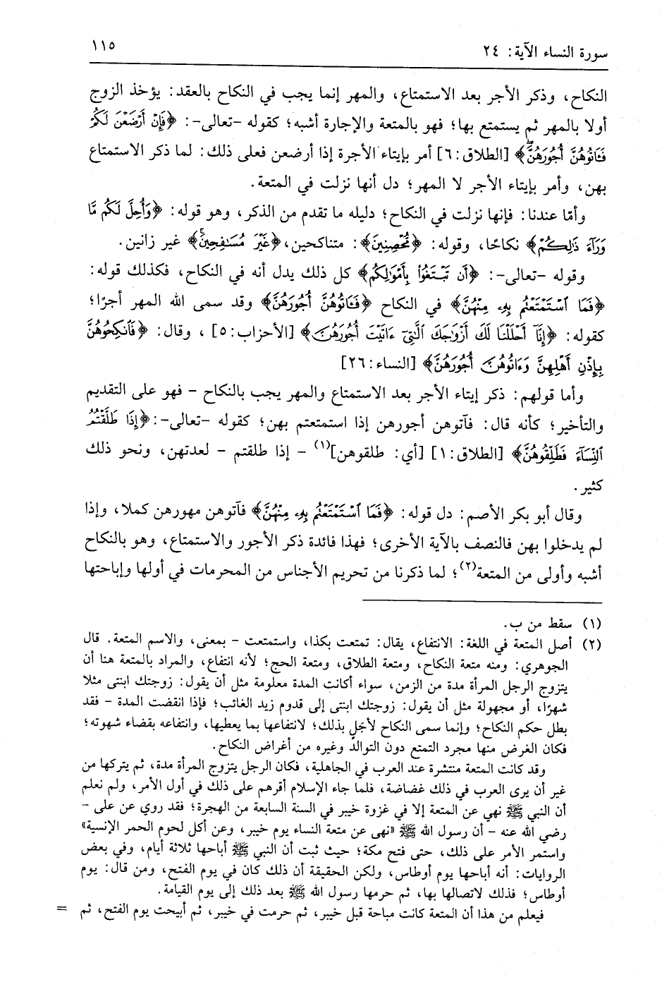 وقوله - تعالى -: (أَنْ تَبْتَغُوا بِأَمْوَالِكُمْ) كل ذلك يدل أنه في النكاح، فكذلك قوله: (فَمَا اسْتَمْتَعْتُمْ بِهِ مِنْهُنَّ) في النكاح (فَآتُوهُنَّ أُجُورَهُنَّ) وقد سمى اللَّه المهر أجرًا؛ كقوله: (إِنَّا أَحْلَلْنَا لَكَ أَزْوَاجَكَ اللَّاتِي آتَيْتَ أُجُورَهُنَّ)، وقال: (فَانْكِحُوهُنَّ بِإِذْنِ أَهْلِهِنَّ وَآتُوهُنَّ أُجُورَهُنَّ).