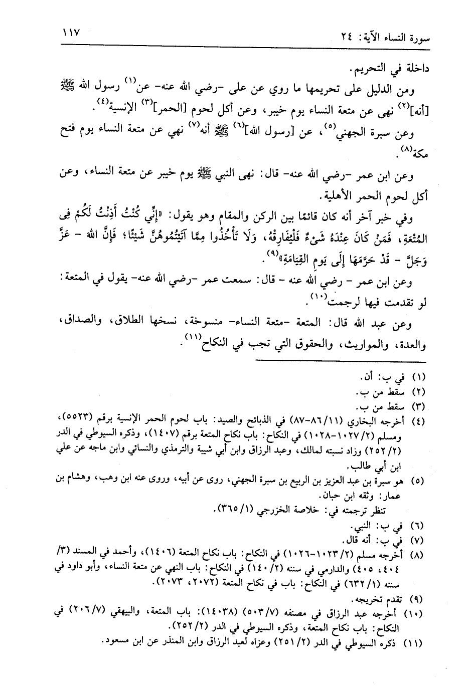 ومن الدليل على تحريمها ما روي عن عليٍّ - رَضِيَ اللَّهُ عَنْهُ - عن رسول اللَّه - صَلَّى اللَّهُ عَلَيهِ وَسَلَّمَ - أنه، نهى عن متعة النساء يوم خيبر، وعن أكل لحوم الحمر الإنسية.