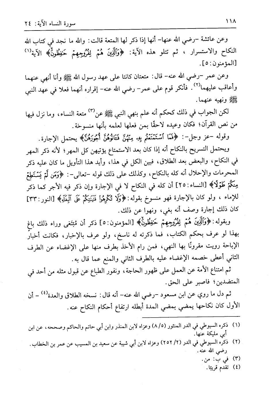 وعن عائشة - رضي اللَّه عنها - أنها إذا ذكر لها المتعة قالت: واللَّه ما نجد في كتاب الله النكاح والاستسرار، ثم تتلو هذه الآية: (وَالَّذِينَ هُمْ لِفُرُوجِهِمْ حَافِظُونَ) الآية.